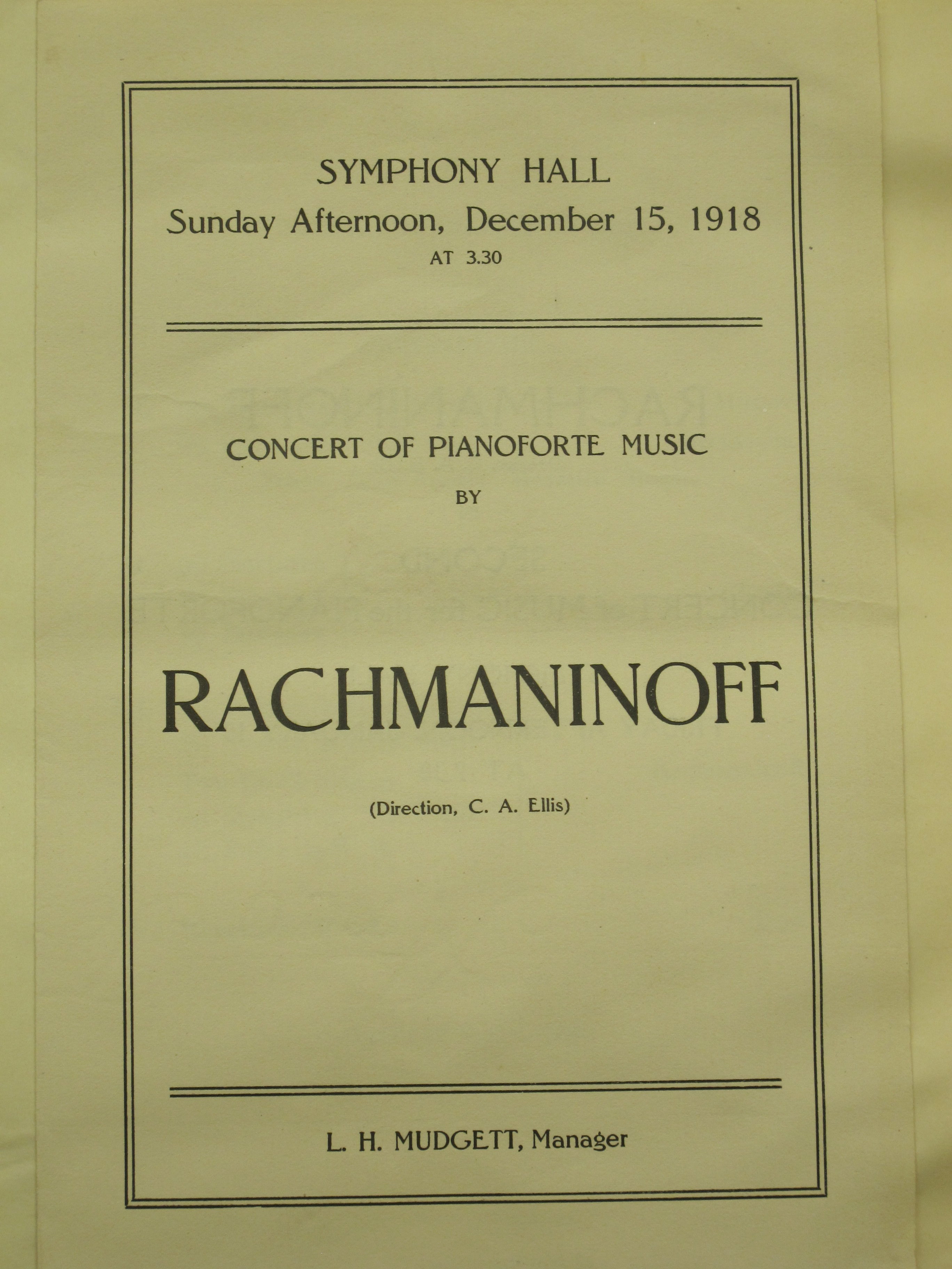 Satina notes that the concert began with ‘the American Hymn’ ('The Star-Spangled Banner'). LoC, Sergei Rachmaninoff Archive, ML31.R33, Papers of Sophie Satin, boxes 82-89. Review: Boston Herald 1918.12.16 p. 11.