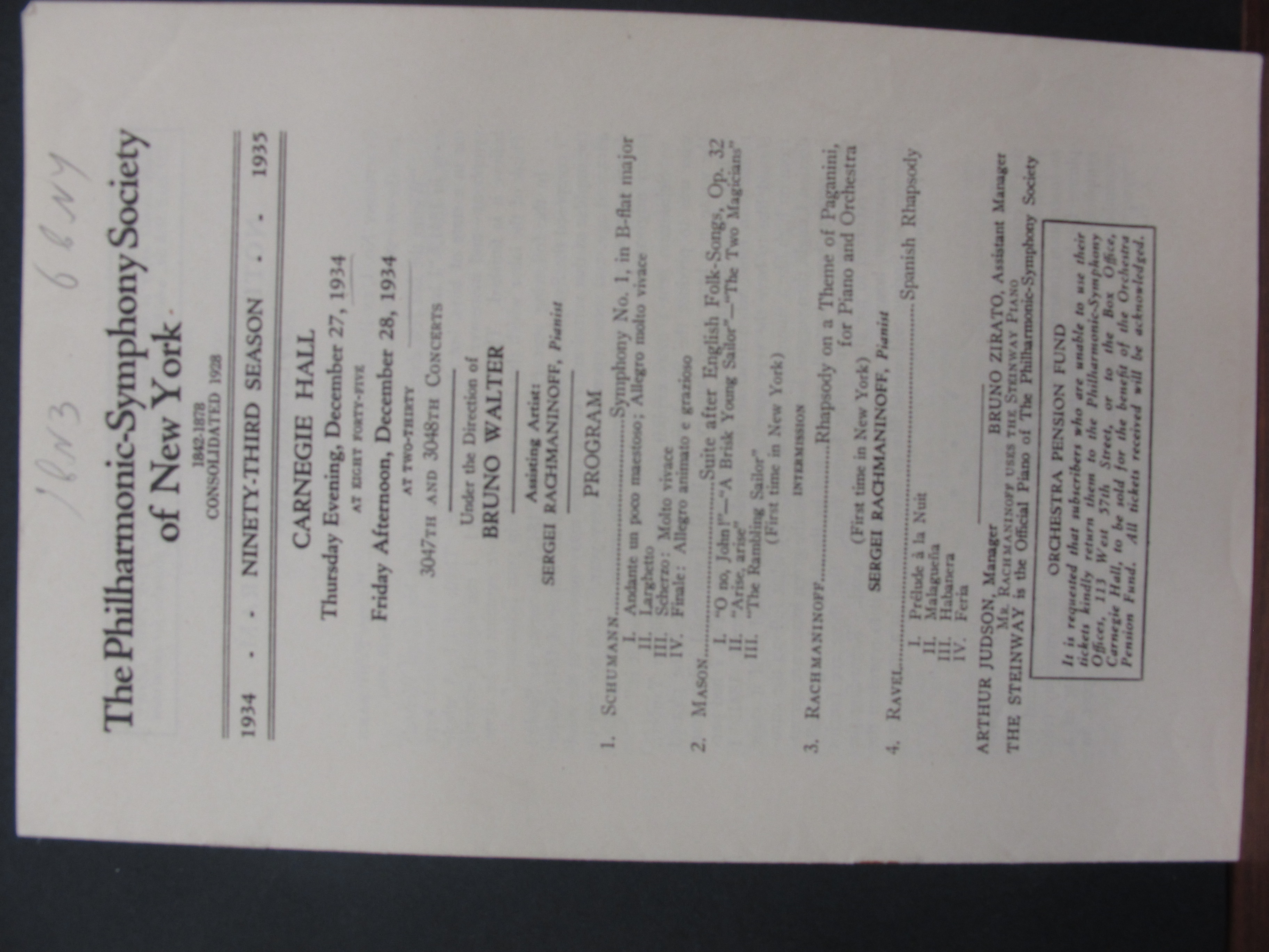 Satina indicates that this concert (which began at 8.45pm) was the 3047th concert of the New York Philharmonic Society, and the first performance of the Paganini Rhapsody in New York. LoC, Sergei Rachmaninoff Archive, ML31.R33, Papers of Sophie Satin, boxes 82-89.
