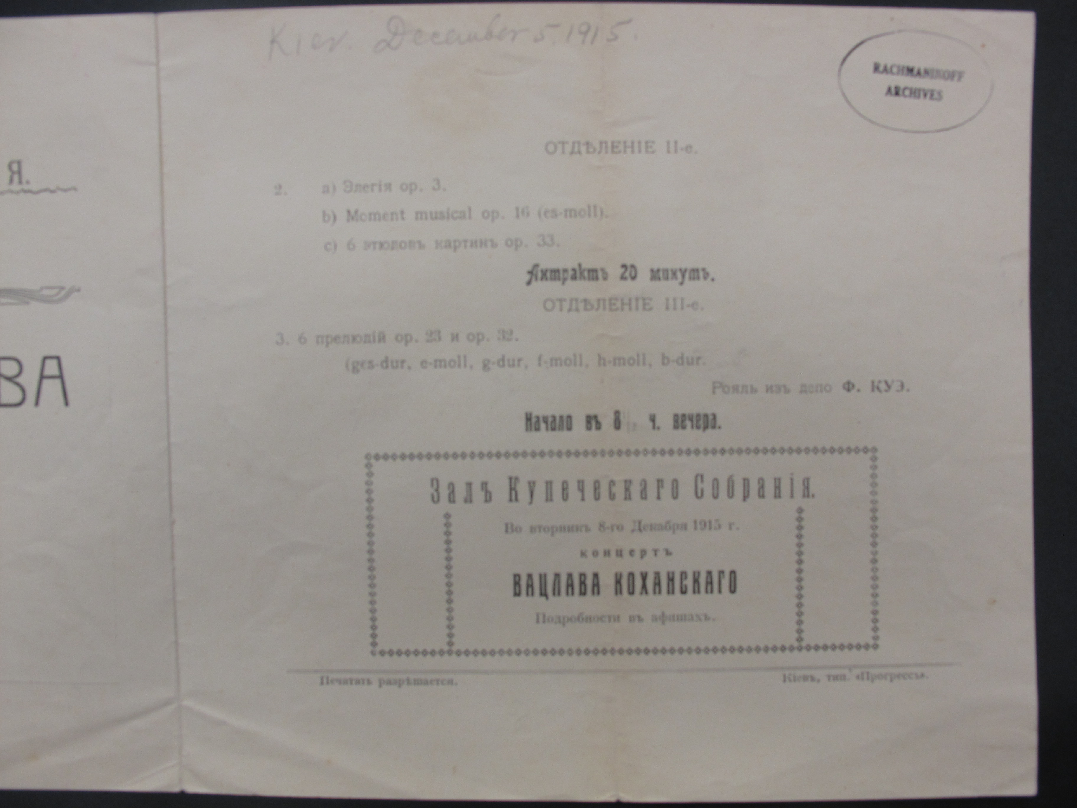 Satina writes: ‘A printed program of this concert has been given to Rachmaninoff by a Russian refugee in Europe. This rare copy is added at present to section 5 of the Rachmaninoff Archive’. LoC, Sergei Rachmaninoff Archive, ML31.R33, Papers of Sophie Satin, boxes 82-89.