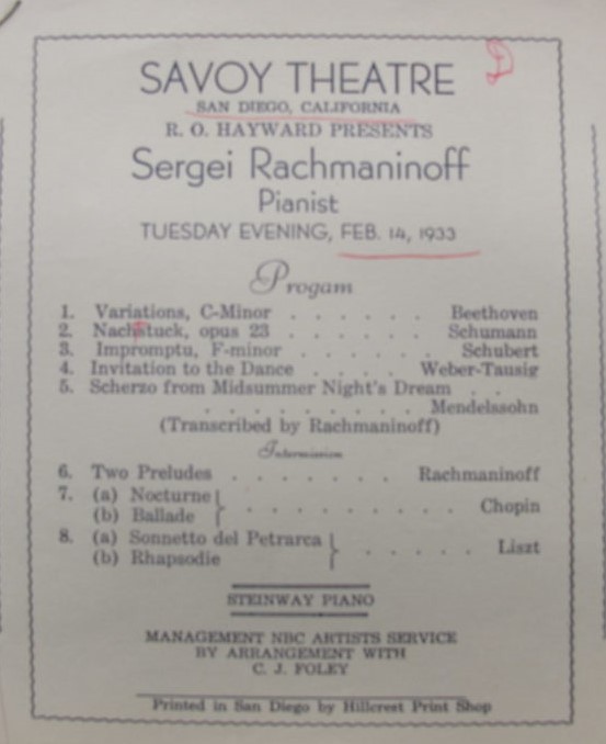 While Satina has indicated that the Nachtstück is in F major, it is possible that it was either no. 2 or no. 4. Satina believed the Schubert Impromptu was D. 935, no. 4, while Martyn (p. 434) indicates D. 935, no. 1. The Liszt Sonetto del Petrarca in E major, no. 104, was frequently played in programs in numerous earlier seasons. A Chopin mazurka, Tausig's transcription of Schumann's Kontrabandiste, Rubinstein's transcription of Beethoven's Turkish March, and Rachmaninoff's transcription of Rimsky-Korsakov's Bumble Bee are noted as the encores in the attached review. LoC, Sergei Rachmaninoff Archive, ML31.R33, Papers of Sophie Satin, boxes 82-89.