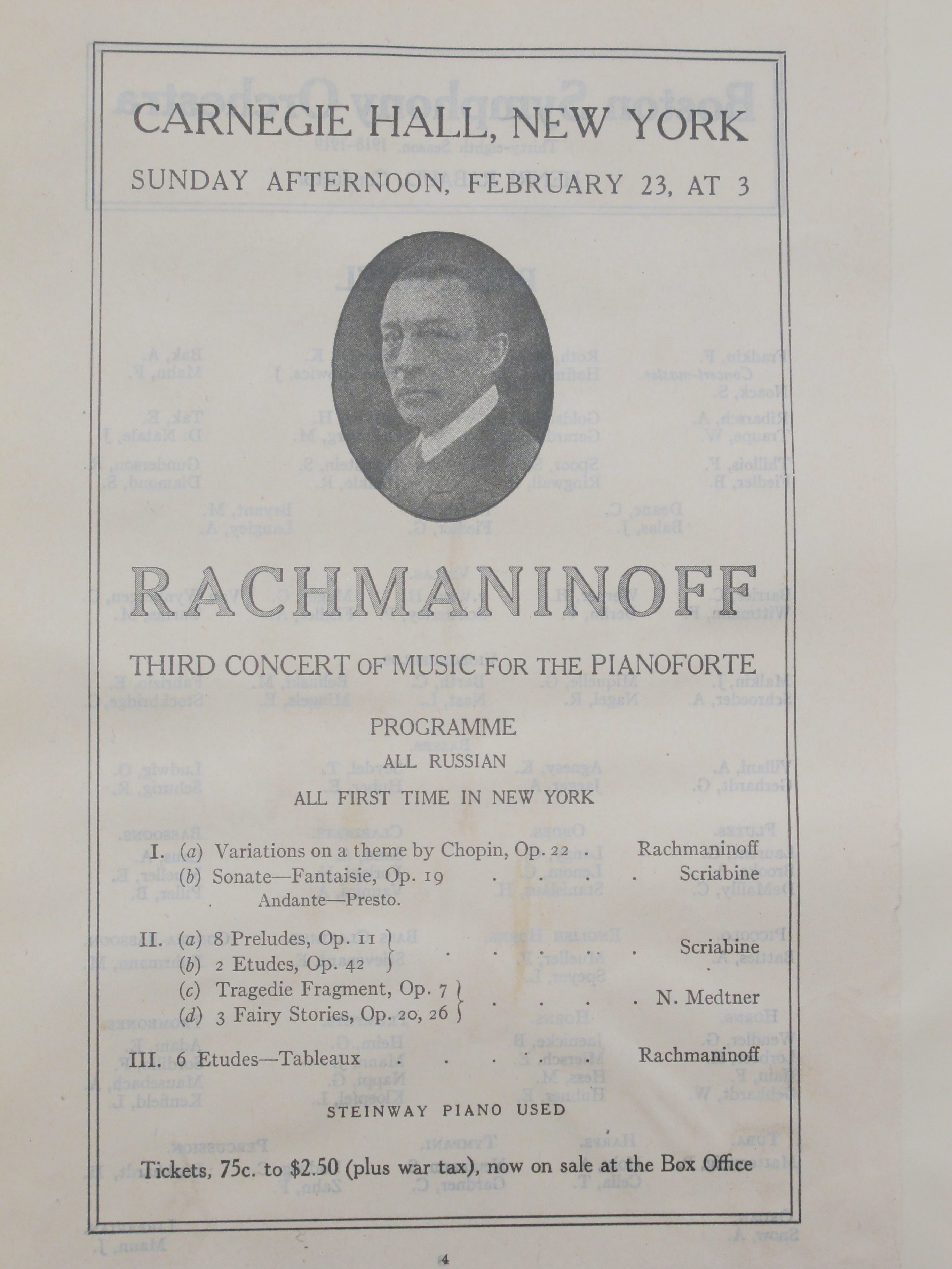 Satina notes that this was the first time Rachmaninoff played an all Russian recital program in New York. It is not indicated whether the 2nd or 3rd piece from Medtner's op. 7 was performed. The third attached review notes that among the audience were Nellie Melba and Geraldine Farrar, and that Rachmaninoff's Prelude in C sharp minor, op. 3, no. 2, was one of a small group of encores at the end. The fourth attached review indicates that 'The Star-Spangled Banner' was played at the beginning. Regarding Rachmaninoff's Variations, op. 22, the first attached review indicates: 'As played yesterday it was in a form somewhat changed from that in which it first was published ten or more years ago. Some six of the original variations were left out yesterday, one, new, was substituted and a bravura finale is now set as a quiet mood.' LoC, Sergei Rachmaninoff Archive, ML31.R33, Papers of Sophie Satin, boxes 82-89.