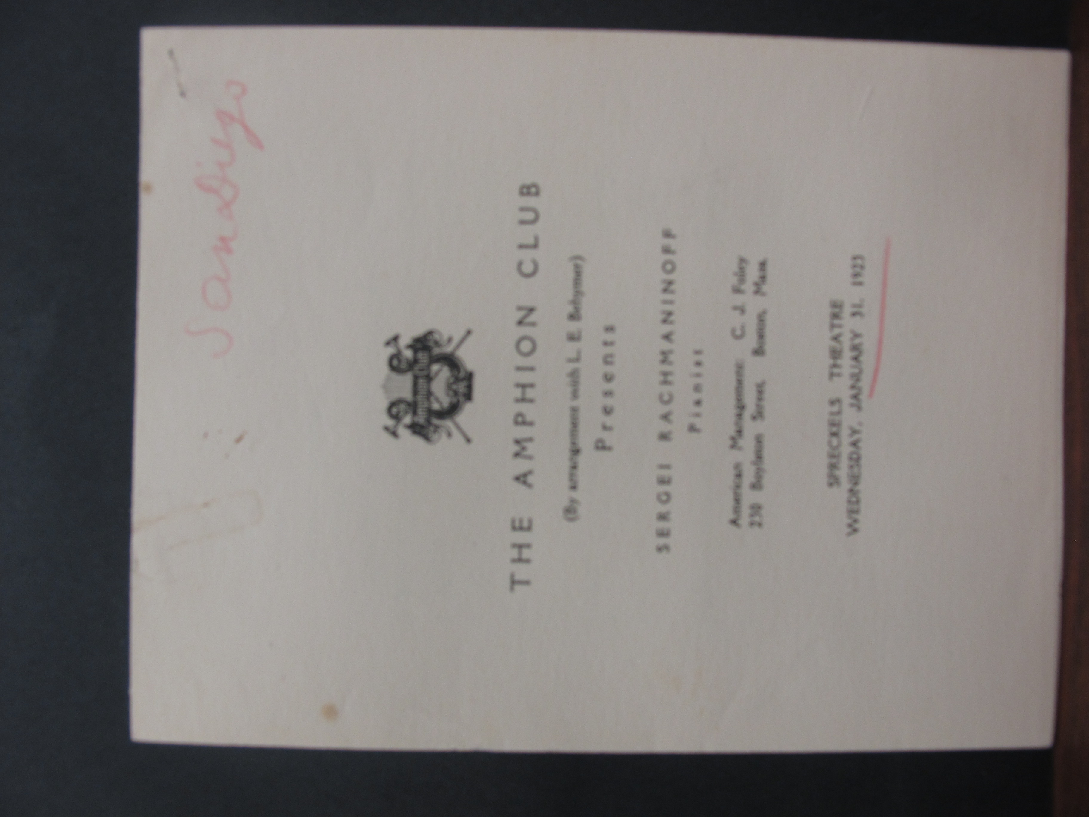 Satina indicates that in other venues where this program was played, the Chopin Nocturne was in F sharp major, op. 15, no. 2, and the Waltz was in F major, op. 34, no. 3. Satina wondered if Liszt’s Sonetto del Petrarca (likely no. 104) was played in this concert, however it is difficult to ascertain from the brief review. A Chopin waltz is noted as an encore after the Sonata, while two unnamed encores were given at the end. LoC, Sergei Rachmaninoff Archive, ML31.R33, Papers of Sophie Satin, boxes 82-89.