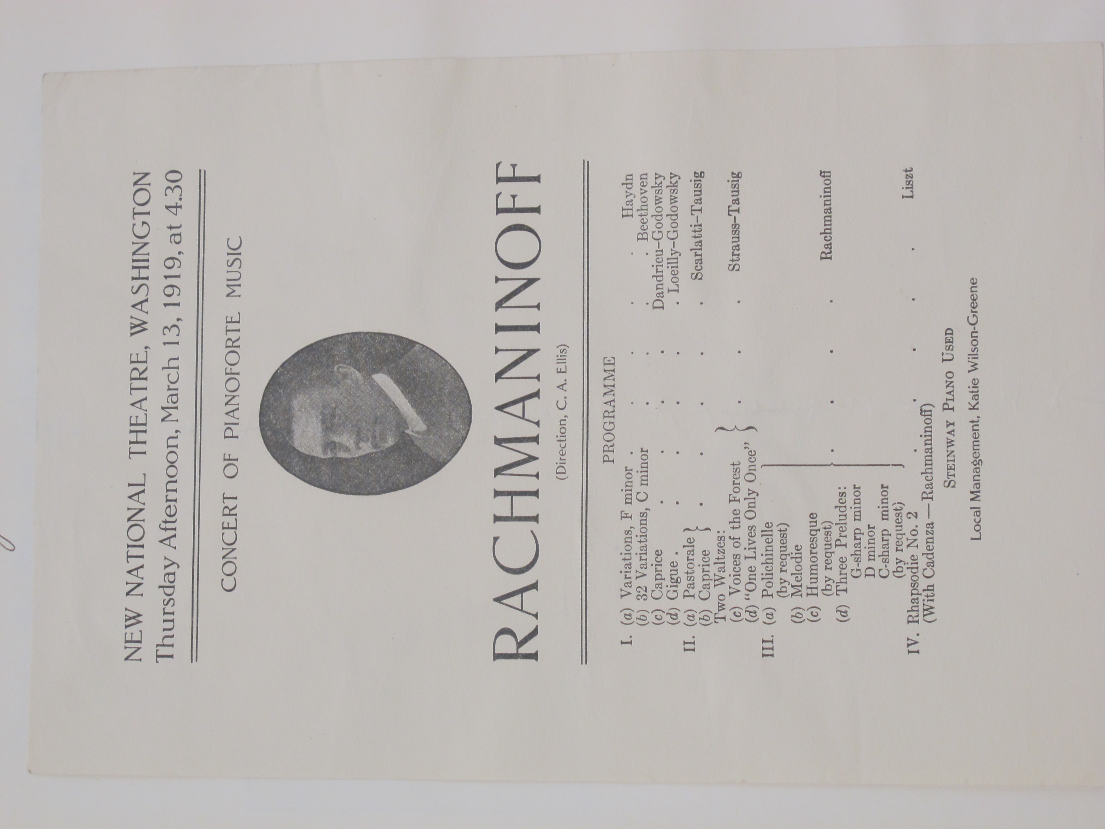 The concert commenced at 4.30pm. Rachmaninoff's Prelude in G minor, op. 23, no. 5, is noted as an encore, along with Tchaikovsky's Troika, a Nocturne perhaps by Field, and a Chopin waltz. LoC, Sergei Rachmaninoff Archive, ML31.R33, Papers of Sophie Satin, boxes 82-89.