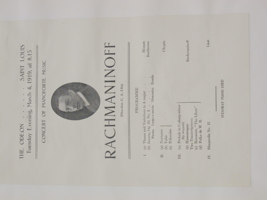 The concert commenced at 8.15pm. The first attached review notes Rachmaninoff began by playing 'The Star-Spangled Banner', and that the Polichinelle, op. 3, no. 4, was one or two encores at the end. LoC, Sergei Rachmaninoff Archive, ML31.R33, Papers of Sophie Satin, boxes 82-89.