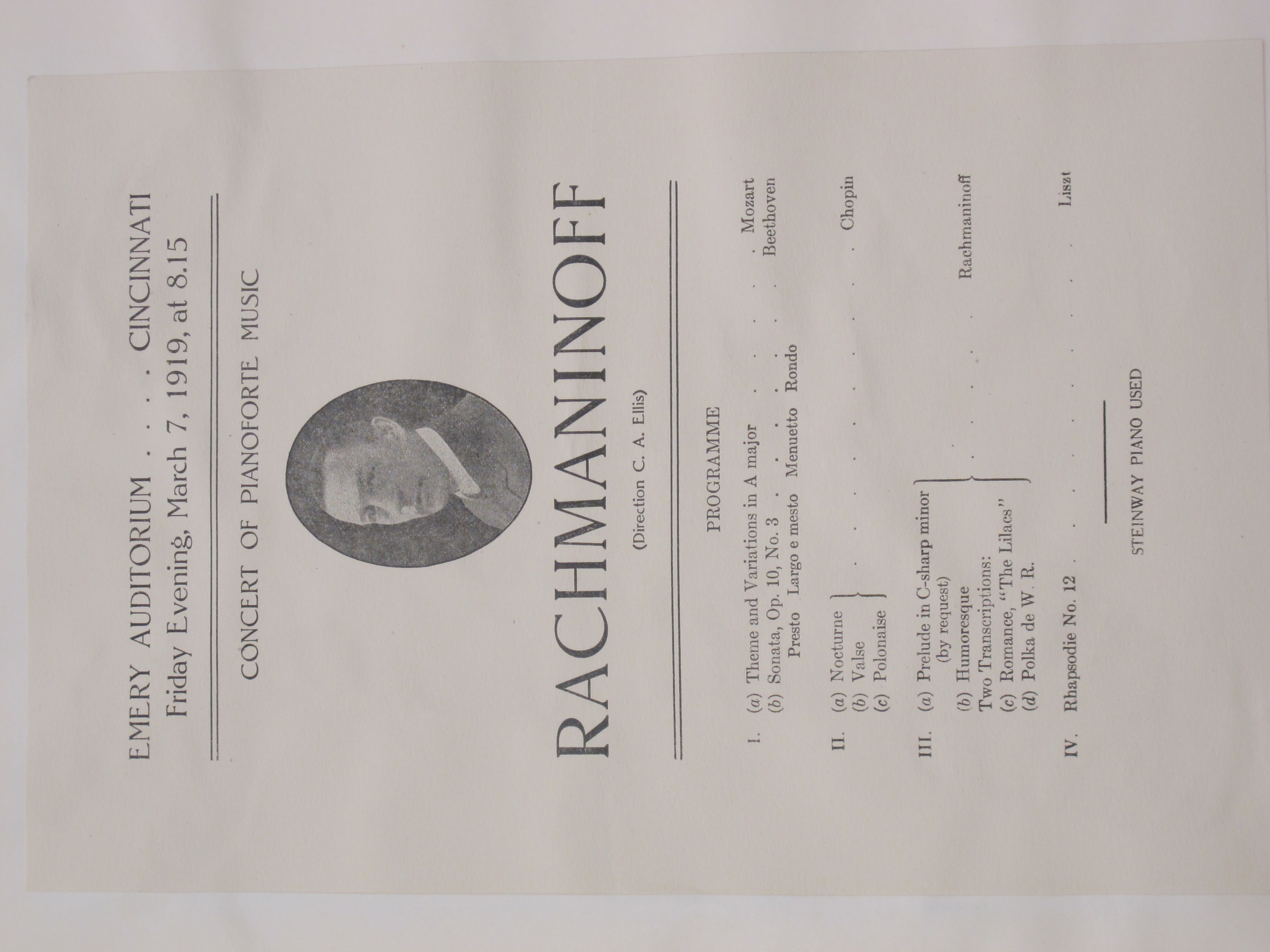 The concert commenced at 8.15pm. The first attached review notes that Rachmaninoff began by playing 'The Star-Spangled Banner', and that Tchaikovsky's Troika and Rachmaninoff's Polichinelle, op. 3, no. 5, were played as encores. As the attached press clipping indicates, the program was different to what was advertised in relation to Rachmaninoff's own works. LoC, Sergei Rachmaninoff Archive, ML31.R33, Papers of Sophie Satin, boxes 82-89.