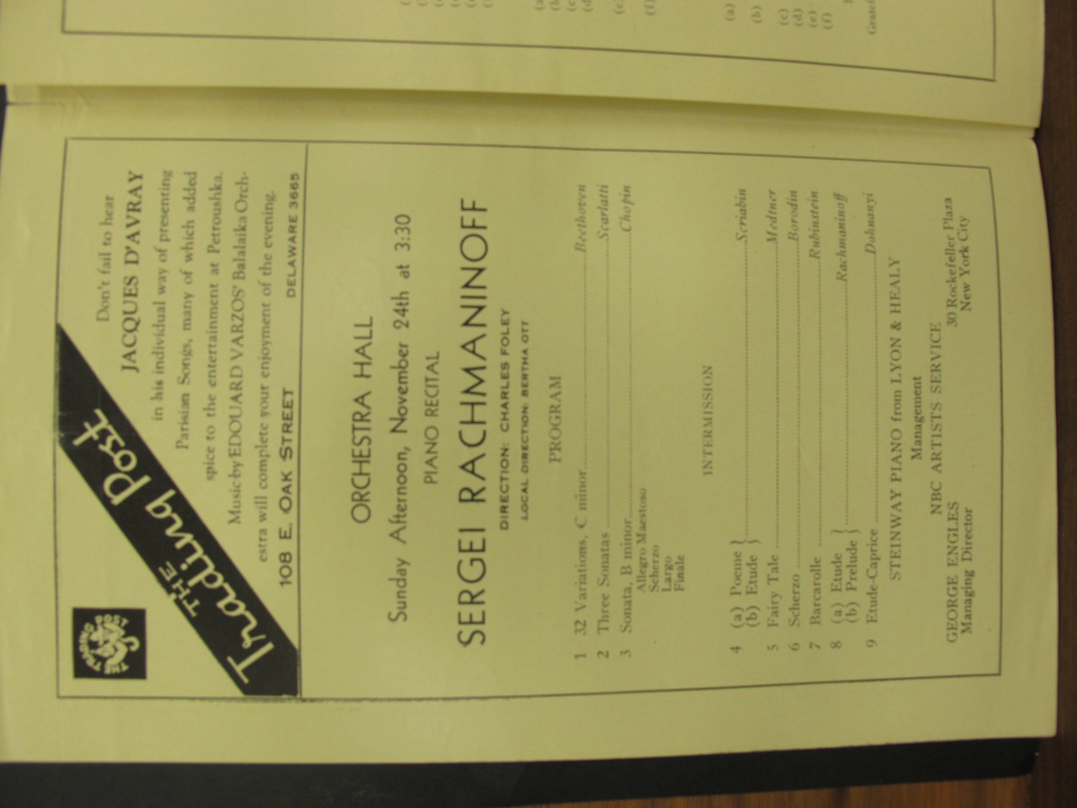 Satina indicates that this concert began at 3pm. LoC, Sergei Rachmaninoff Archive, ML31.R33, Papers of Sophie Satin, boxes 82-89.
