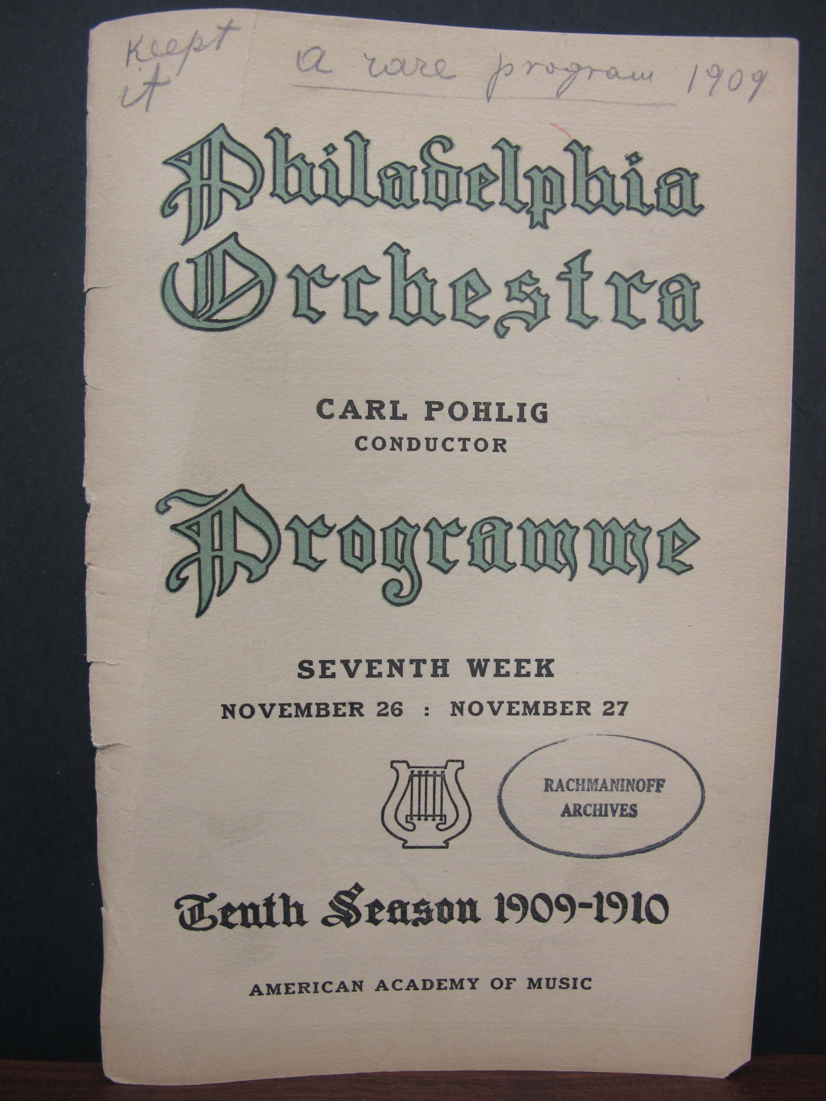 While the attached review does not mention Tchaikovsky's 1812, nor Karl Pohlig, the complete program is printed in the attached press clipping. LoC, Sergei Rachmaninoff Archive, ML31.R33, Papers of Sophie Satin, boxes 82-89. Review: Philadelphia Inquirer 1909.11.27 p. 15.